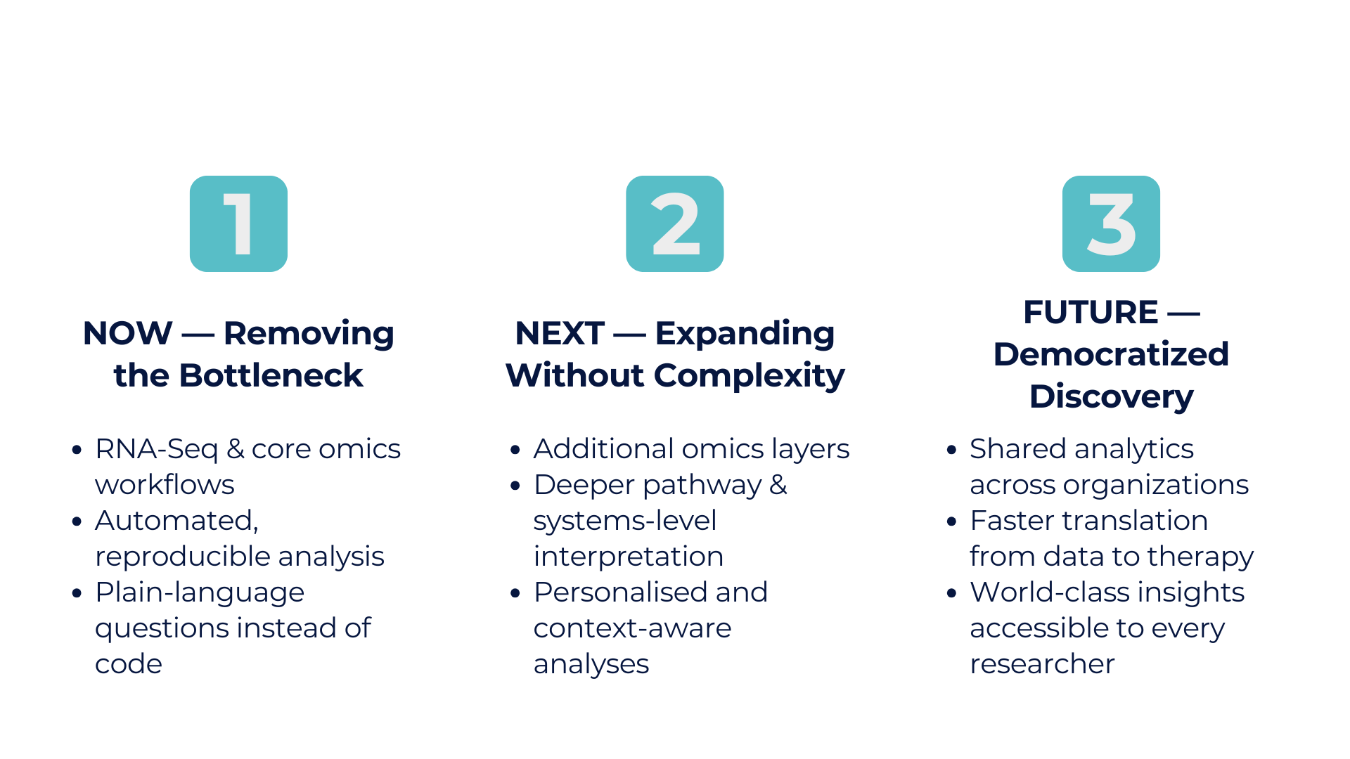 Our vision is simple, but ambitious: every research team, regardless of size, should be able to turn complex biomedical data into reliable insight — quickly, reproducibly, and without unnecessary barriers.