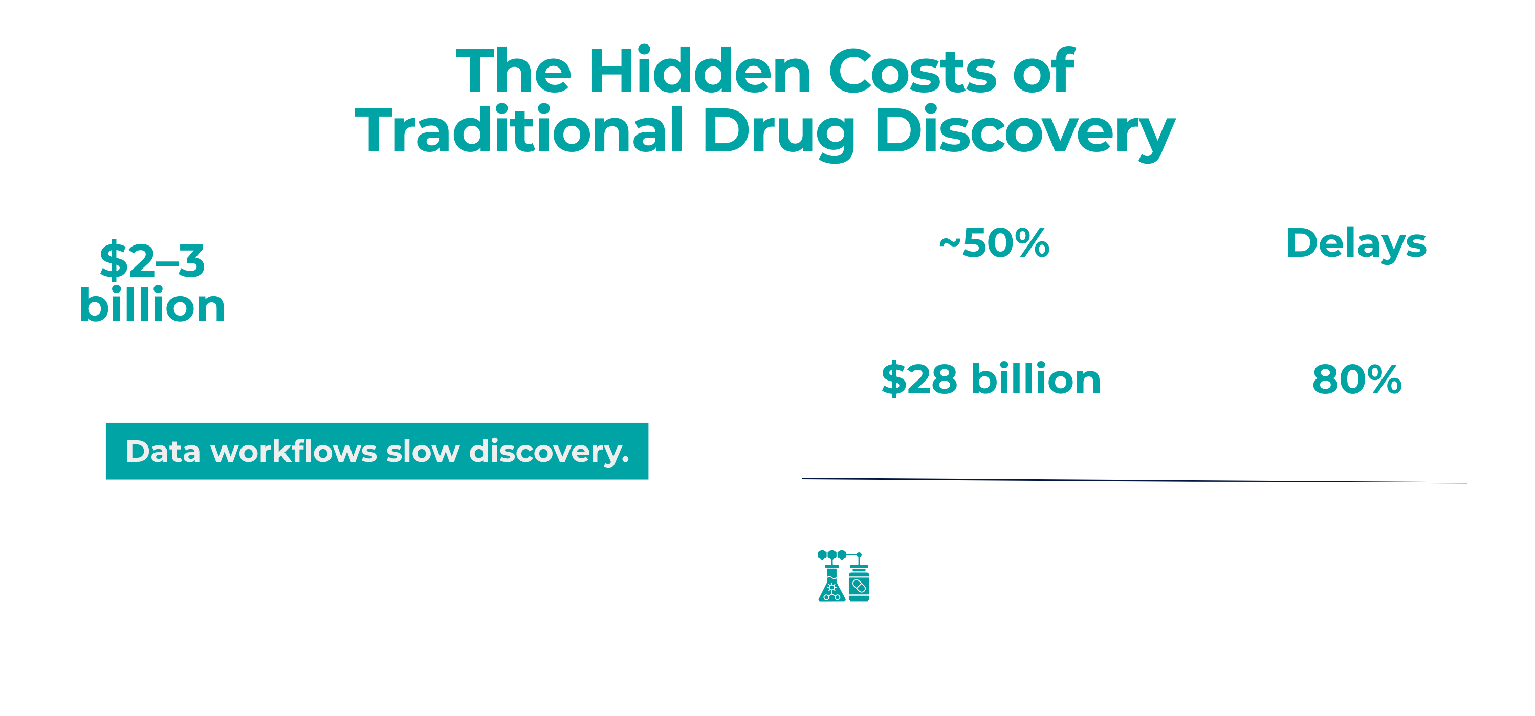 At aimed analytics, partnerships are central to how we work. Our philosophy is that combining strengths multiplies outcomes. We provide an AI-driven analytics platform purpose-built for biomedical research, and we collaborate closely with domain experts like TME Pharma who bring deep disease-area knowledge. This model allows us to address the biggest pain points in drug discovery together. Consider the traditional approach: a pharma company might spend weeks analyzing experimental data or trying to identify a drug target, then start new experiments, and so on—a sequential, time-consuming cycle.